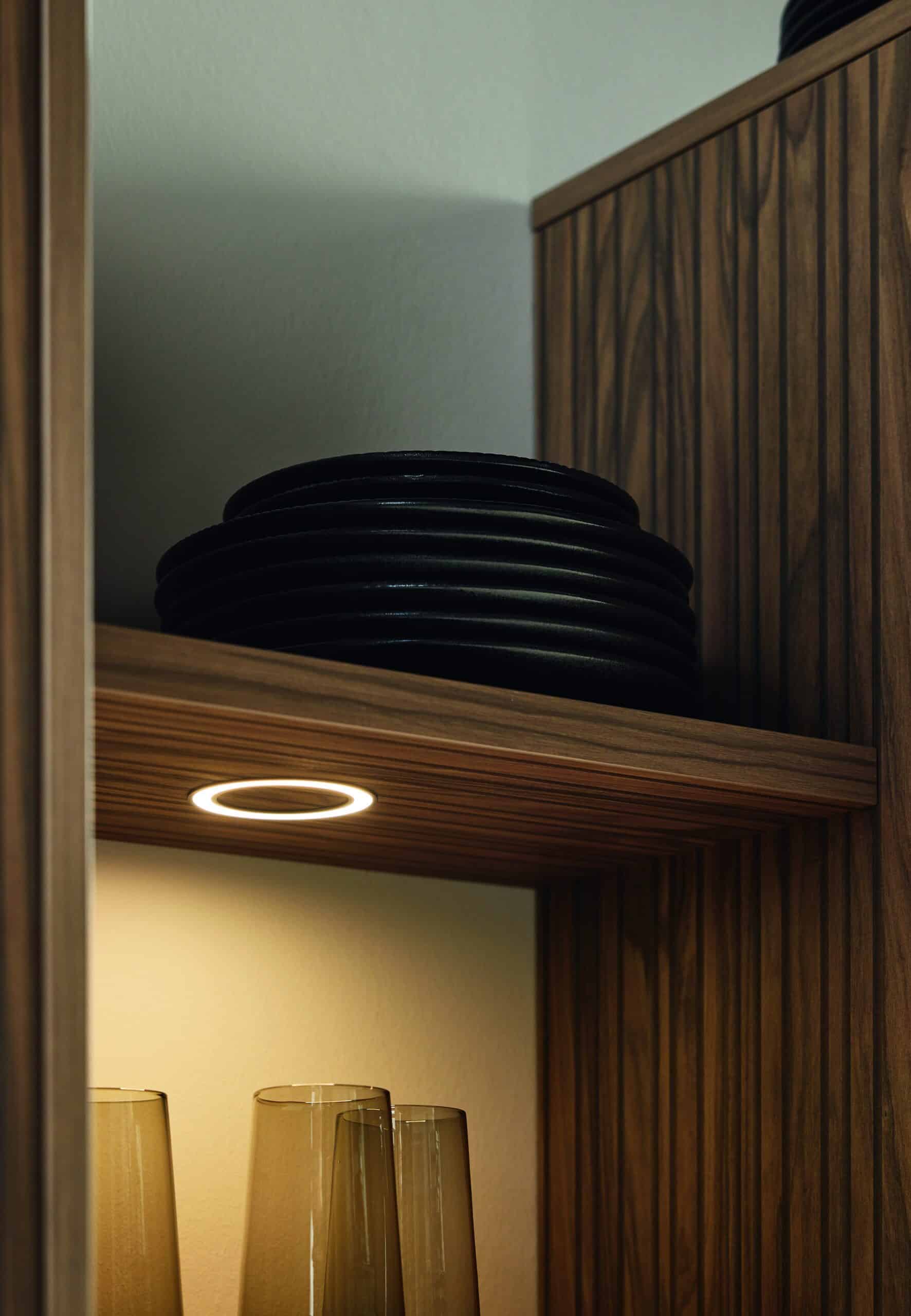Unsere Schränke, vielfältige Dekore, integrierte Leuchten. Maßvariable Schranktypen. Einsatz von Einbauleuchten in Schränken sowie als offene Beleuchtung
